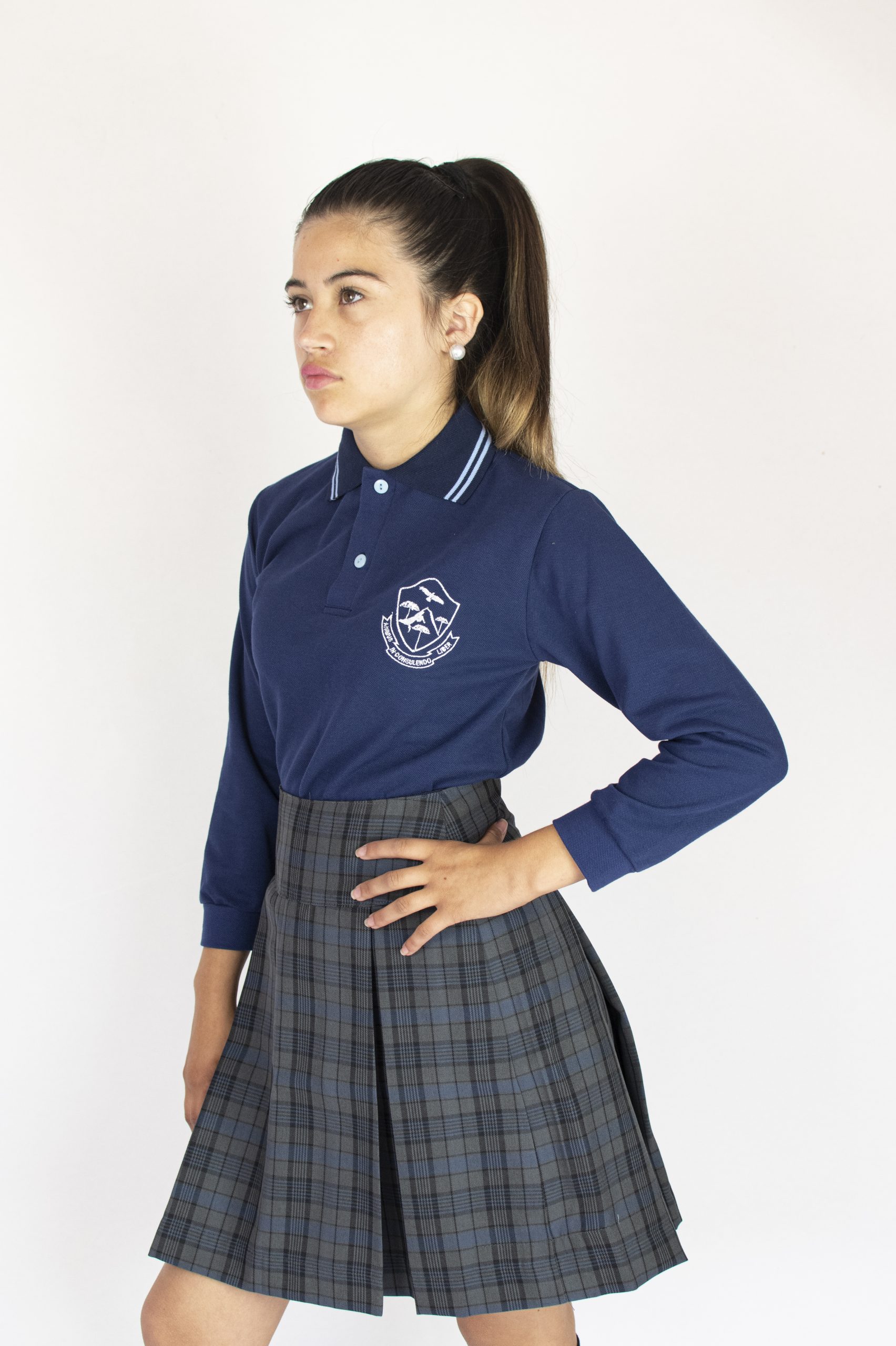 Falda Escolar cuadrille gris. Pretina alta. Cierre, tablas reforzadas. Pliegue y costuras reforzadas.